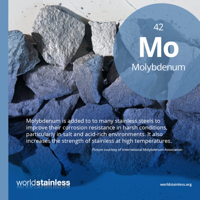 Molybdenum is a metallic element which is most frequently used as an alloying addition in alloy and stainless steels. Its alloying versatility is unmatched because its addition enhances strength, hardenability, weldability, toughness, elevated temperature strength and corrosion resistance.