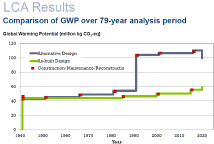 The Progreso pier was built in 1941, using stainless steel rebar. The LCA /LCC comparisons were made with an hypothetical alternative of C-steel rebar. They show that stainless rebar results in a lower Life Cycle Cost and a lower Global Warming Potential.