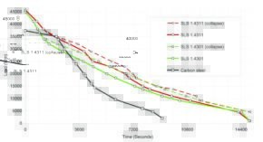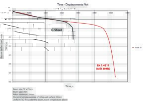 The curve below obtained by computer simulation illustrates how a concrete beam reinforced with either C-steel or stainless steel (grade EN 1.4311 – AISI 304N) bends under load in case of fire (ISO 834 standard – cellulosic fire). Beam deflection increases with time (and beam temperature) until it cannot anymore bear the load.