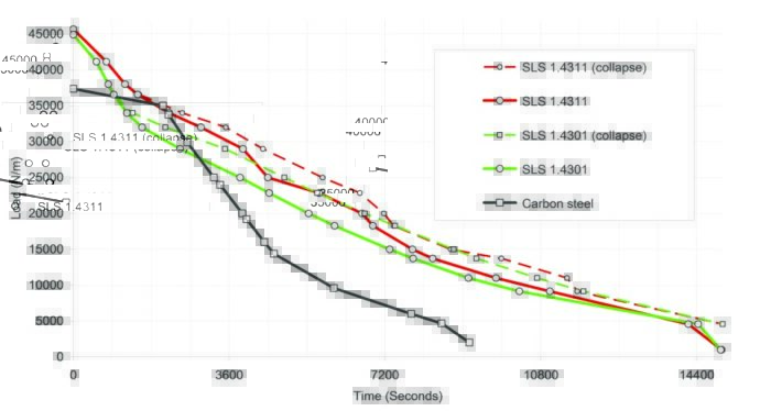 Stainless steel almost doubles the time before the beam collapses. In addition, the high elongation provides a progressive onset of beam failure and therefore warns of imminent danger.