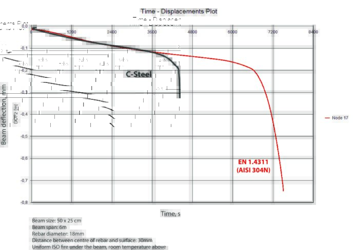 Computer simulations show that the fire resistance of Stainless reinforced beams is much better than that of carbon steel reinforced ones.