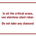 “The advantage of stainless steel is the extremely slow rate at which it corrodes in a concrete/chloride environment. Minimal corrosion damage is anticipated during a service life of 75 years. Although it is much more expensive to purchase than black or epoxy-coated reinforcing steel, it is more cost-effective over the long term because the corrosion-induced damage typically seen with black steel and coated steel will not occur.”
