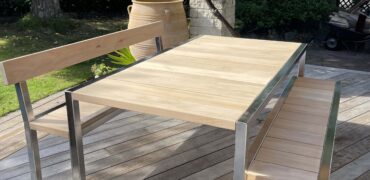 Heavy duty non-fixed outdoor furniture comprising stainless steel & wood table and bench seats