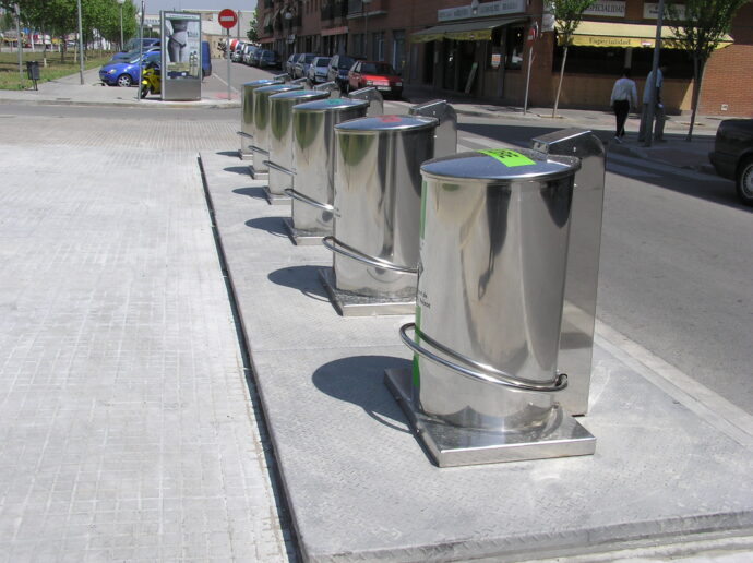 These attractive stainless steel waste disposal units stand on top of an underground container system which hides the waste below street level, thus creating a positive  environmental impact by overcoming the risks of mishandling waste disposal bins, or failure to empty the bins.