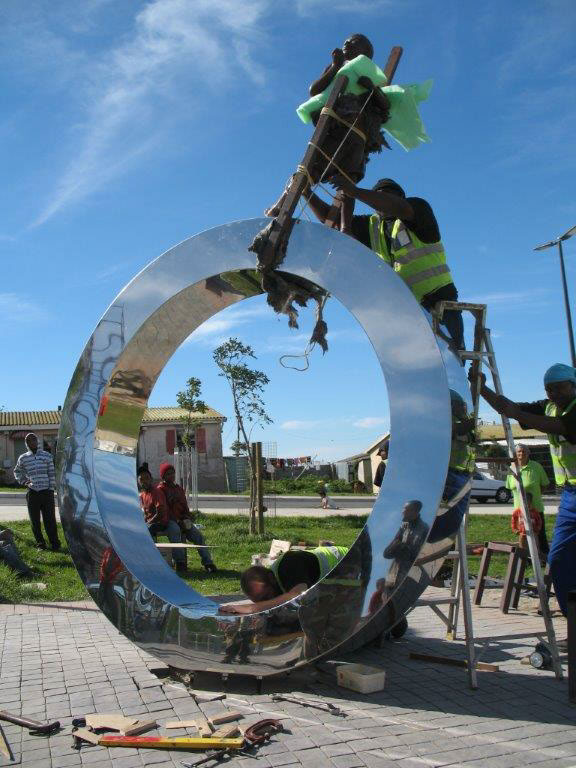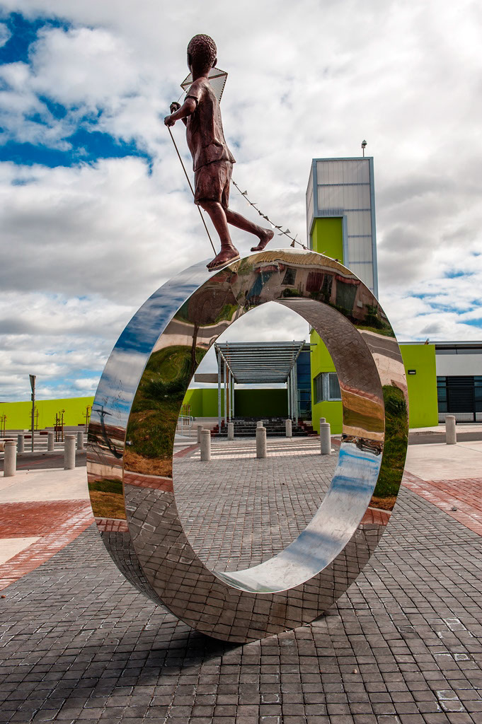 The primary art piece, called “Kite Boy,” consists on an annulus (ring-shaped) form, out of reflective stainless steel, that evokes movement, upon which a figure of a young child out of cast resin, balances, while looking towards the Centre and flying a kite. This art piece has truly become a focal point in the community.