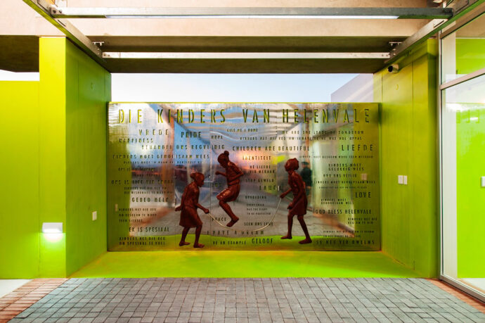 Directly across from Kite Boy, on the opposite side of the Community Plaza, at the main entrance to the Center, stands the Mural featuring words and phrase chosen as a result of a community activation process conducted by the German Development Bank. The text has been cut into reflective stainless steel sheeting. The mural also includes resin cast figures of three children playing.
