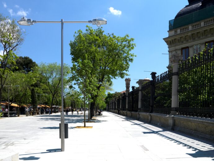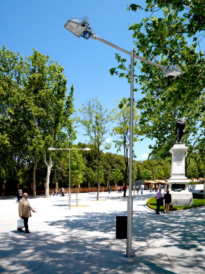This example is situated in Cuesta de Moyano in Madrid, a typical meeting point for a book market. This interesting creation is capable of supporting sodium lamp with high pressure and halogen up to 250 w. The light emitted fits more comfortably with the pedestrian environment.